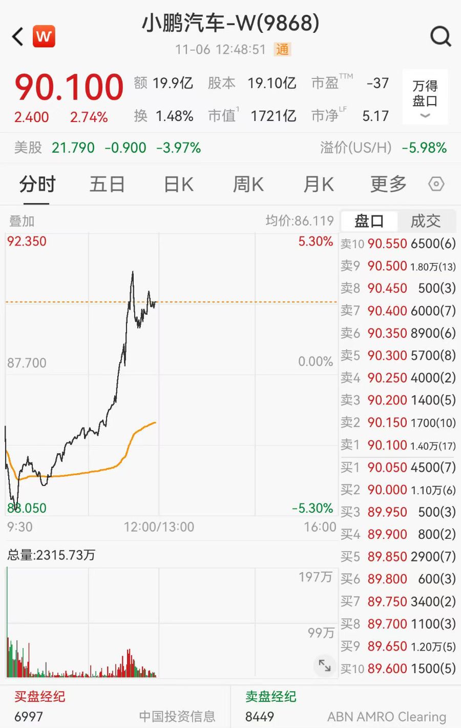 视频发布后,小鹏汽车港股直线拉升翻红。截至午间收盘,小鹏汽车股价报90.1港元/股,市值1721亿港元,涨2.74%。