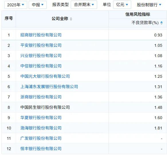 其不良贷款率1.48%,除了数据不可得的广发银行和恒丰银行,民生银行排在了第8位,仅高于华夏银行和渤海银行。