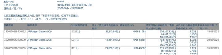 据香港交易所,9月9日,摩根大通减持民生银行1336.1万股,每股均价4.3394港元,总金额约为5797.88万港元。减持后最新持股数目约为4.93亿股,持股比例为5.92%;