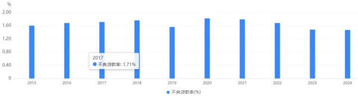 资产质量方面,民生银行不良贷款率呈现“先升后降再趋稳”的走势。2015–2016年不良率由1.60%微升至1.68%,反映当时信用风险初步暴露;随后通过加强风险管控与不良处置,2017–2022年间不良率逐步回落,2023年后稳定在1.5%以下,资产质量压力得到有效控制。