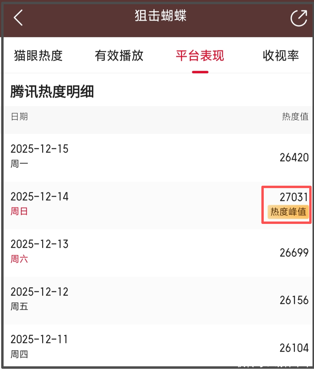 和陈晓新剧黯然收官相比,陈妍希主演的《狙击蝴蝶》堪称一路高歌,热度节节攀升。《大生意人》收官的日子,《狙击蝴蝶》热度迎来新高,达到了26699。次日,该剧的热度更是突破了27000大关,迎来了新的热度峰值。从数据上来看,两部剧的热度还真是“此消彼长”啊。