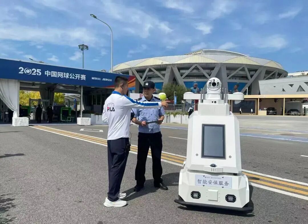 本届赛事首次启用了8台安保机器人,分布在国家网球中心主要出入口及园区重要交通节点,可用于实时路面监控、观众一键求助、普及赛事礼仪、提供通行指引等。